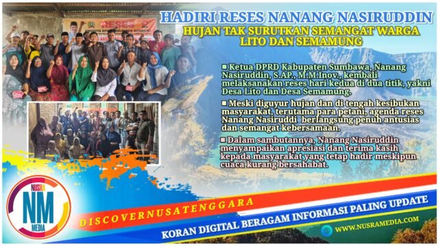 NUSRAMEDIA.COM — Ketua DPRD Kabupaten Sumbawa, Nanang Nasiruddin, S.AP., M.M.Inov., kembali melaksanakan reses Masa Sidang I Tahun 2026 hari kedua di dua titik, yakni Desa Lito dan Desa Semamung.