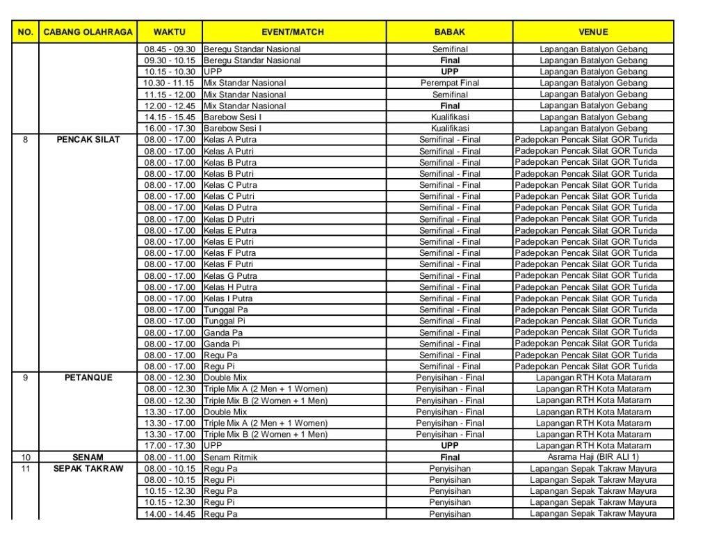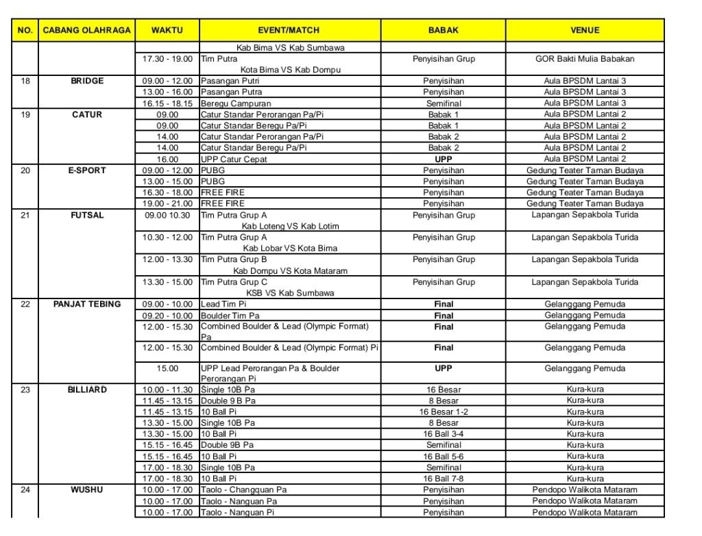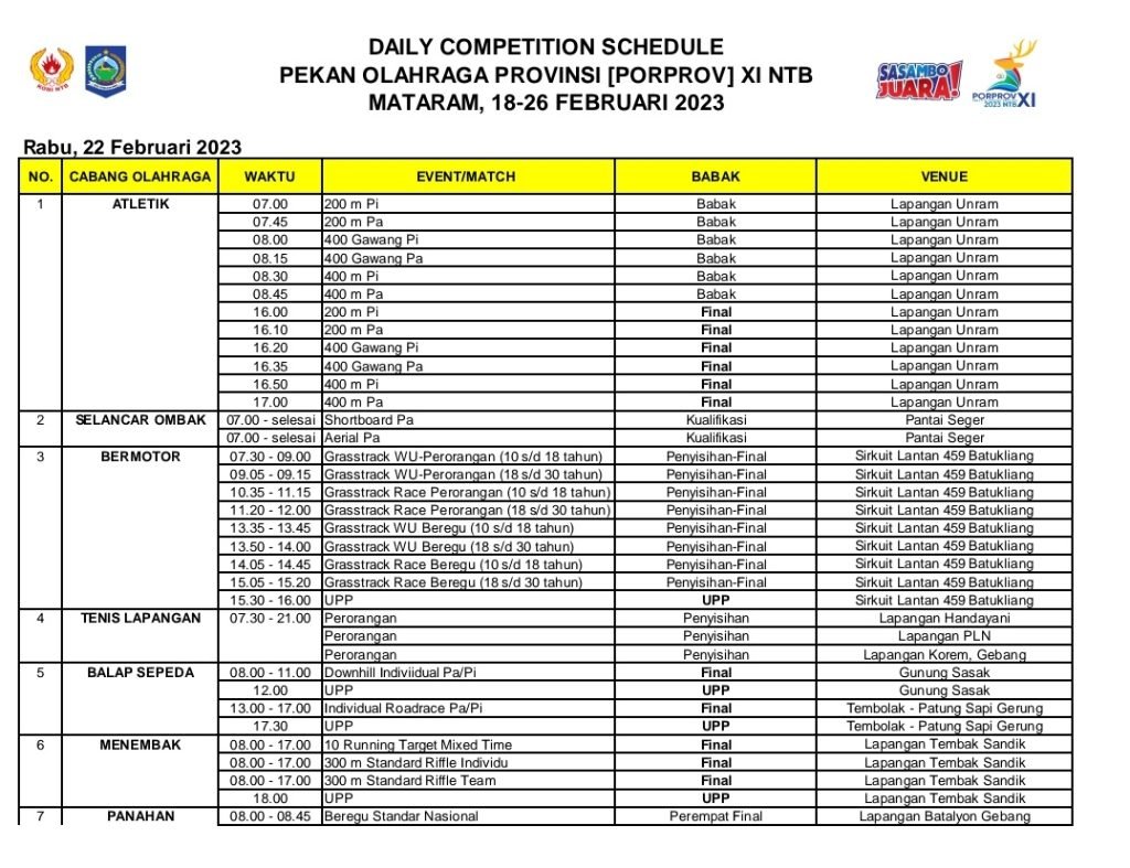 Berikut jadwal dan lokasi cabor-cabor yang akan bertanding diajang Porprov XI NTB 2023 hari ini :