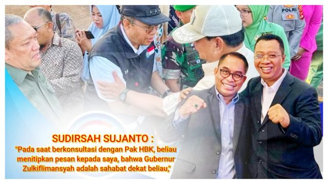 “Pada saat berkonsultasi dengan Pak HBK, beliau menitipkan pesan kepada saya, bahwa Gubernur Zulkiflimansyah adalah sahabat dekat beliau,” ungkap Sudirsah Sujanto.