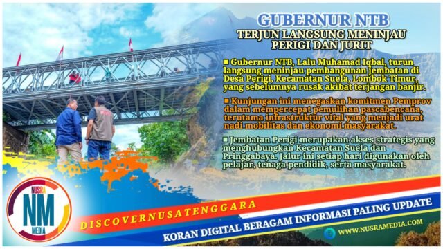 NUSRAMEDIA.COM — Gubernur Nusa Tenggara Barat (NTB), Lalu Muhamad Iqbal, turun langsung meninjau pembangunan jembatan di Dusun Beta, Desa Perigi, Kecamatan Suela, Lombok Timur, yang sebelumnya rusak akibat terjangan banjir.