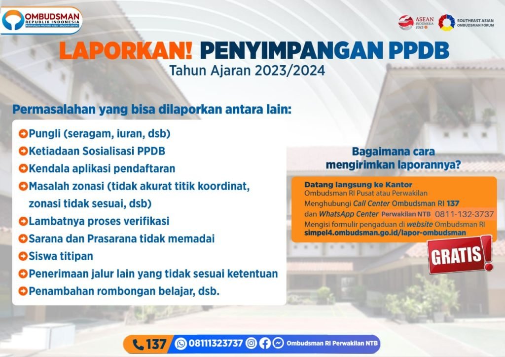 NUSRAMEDIA.COM — Ombudsman RI Perwakilan Nusa Tenggara Barat mendorong pembentukan focal point dan pengelolaan pengaduan penyelesaian laporan maladministrasi Penerimaan Peserta Didik Baru (PPDB) 2023.