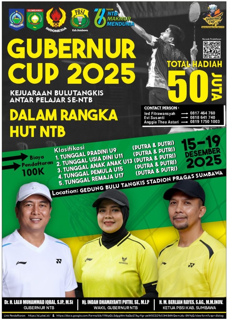 “Jika pelaksanaannya berjalan sukses, Piala Gubernur NTB akan kami jadikan agenda tahunan,” ungkap pria yang juga Wakil Ketua I DPRD Kabupaten Sumbawa tersebut. Tahun ini total hadiah mencapai Rp50 juta.