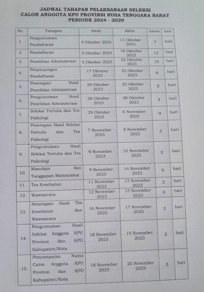 BERIKUT JADWAL TAHAPAN PELAKSANAAN SELEKSI CALON ANGGOTA KPU PROVINSI NTB PERIODE 2024-2029 :