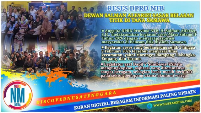NUSRAMEDIA.COM — Anggota DPRD Provinsi Nusa Tenggara Barat (NTB), H. Salman Alfarizi, S.H., melaksanakan kegiatan reses Masa Sidang II Tahun 2026 dengan menyerap aspirasi masyarakat di 14 titik yang tersebar di wilayah Kabupaten Sumbawa.