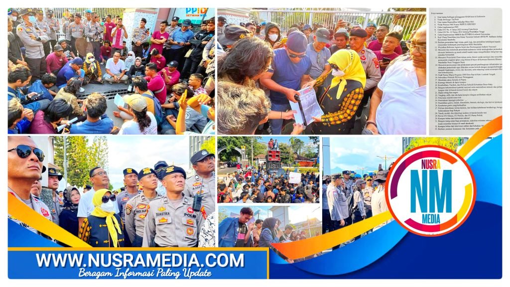 NUSRAMEDIA.COM — Mahasiswa yang tergabung dalam Aliansi Rakyat NTB Menggugat mendatangi Kantor DPRD Provinsi Nusa Tenggara Barat, Jum’at (20/10/2023).