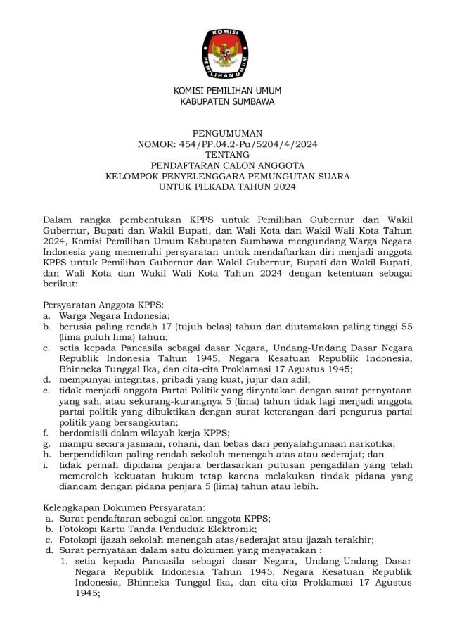 Beranda IKLAN KPU Sumbawa : Pengumuman Pendaftaran KPPS Pilkada 2024IKLANKPU Sumbawa : Pengumuman Pendaftaran KPPS Pilkada 2024Penulis Redaksi - 17 September 2024FacebookTwitterPinterestWhatsAppLinkedinTelegramLINESurelCopy URL ARTIKEL TERKAITDARI PENULIS IKLANKeluarga Besar Bank NTB Syariah : Selamat Milad KSB ke-22 IKLANKeluarga Besar DPRD NTB : Dirgahayu Kabupaten Sumbawa Barat ke-22 IKLANSEKRETARIS F-DEMOKRAT NTB SYAMSUL FIKRI : SELAMAT HARI PAHLAWAN 2025 IKLANKELUARGA BESAR DPRD NTB : SELAMAT HARI SUMPAH PEMUDA 2025 IKLANGelegar Akhir Tahun Bank NTB Syariah : Pembiayaan Sejahtera iB Amanah IKLANBank NTB Syariah : Selamat Milad Lombok Tengah ke-80 IKLANBank NTB Syariah : Selamat Milad ke-32 Kota Mataram IKLANKetua Fraksi ABNR (PAN)-Sekretaris Komisi IV DPRD NTB, Hasbullah Muis Konco : Dirgahayu RI ke-80 IKLANKetua Komisi V DPRD NTB-Lalu Sudiartawan : Dirgahayu RI ke-80 IKLANAnggota DPRD Sumbawa Barat-Norvie Aperiansyani : Dirgahayu RI ke-80 IKLANKetua Komisi IV DPRD Sumbawa-M Takdir : Dirgahayu RI ke-80 IKLANKetua DPRD Sumbawa-Nanang Nasiruddin : Dirgahayu RI ke-80