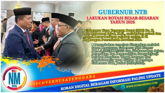 NUSRAMEDIA.COM — Gubernur Nusa Tenggara Barat (NTB) Dr. H. Lalu Muhamad Iqbal, M.Si., melakukan rotasi dan mutasi besar-besaran pejabat eselon II di lingkungan Pemerintah Provinsi NTB. Langkah ini menjadi penataan strategis pascapenerapan Struktur Organisasi dan Tata Kerja (SOTK) baru yang mulai berlaku awal 2026.