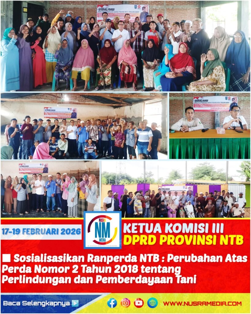 NUSRAMEDIA.COM — Ketua Komisi III DPRD Provinsi Nusa Tenggara Barat, H. Sambirang Ahmadi, S.Ag., M.Si., melaksanakan kegiatan Sosialisasi Rancangan Peraturan Daerah (Ranperda) tentang Perubahan atas Peraturan Daerah Nomor 2 Tahun 2018 mengenai Perlindungan dan Pemberdayaan Petani.