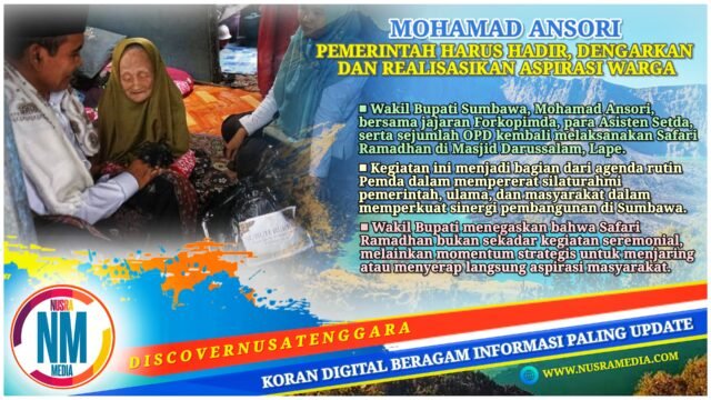 NUSRAMEDIA.COM — Wakil Bupati Sumbawa, Mohamad Ansori, bersama jajaran Forkopimda, para Asisten Setda, serta sejumlah Organisasi Perangkat Daerah (OPD) lingkup Pemerintah Kabupaten Sumbawa, kembali melaksanakan Safari Ramadhan di Masjid Darussalam, Kecamatan Lape, kemarin.